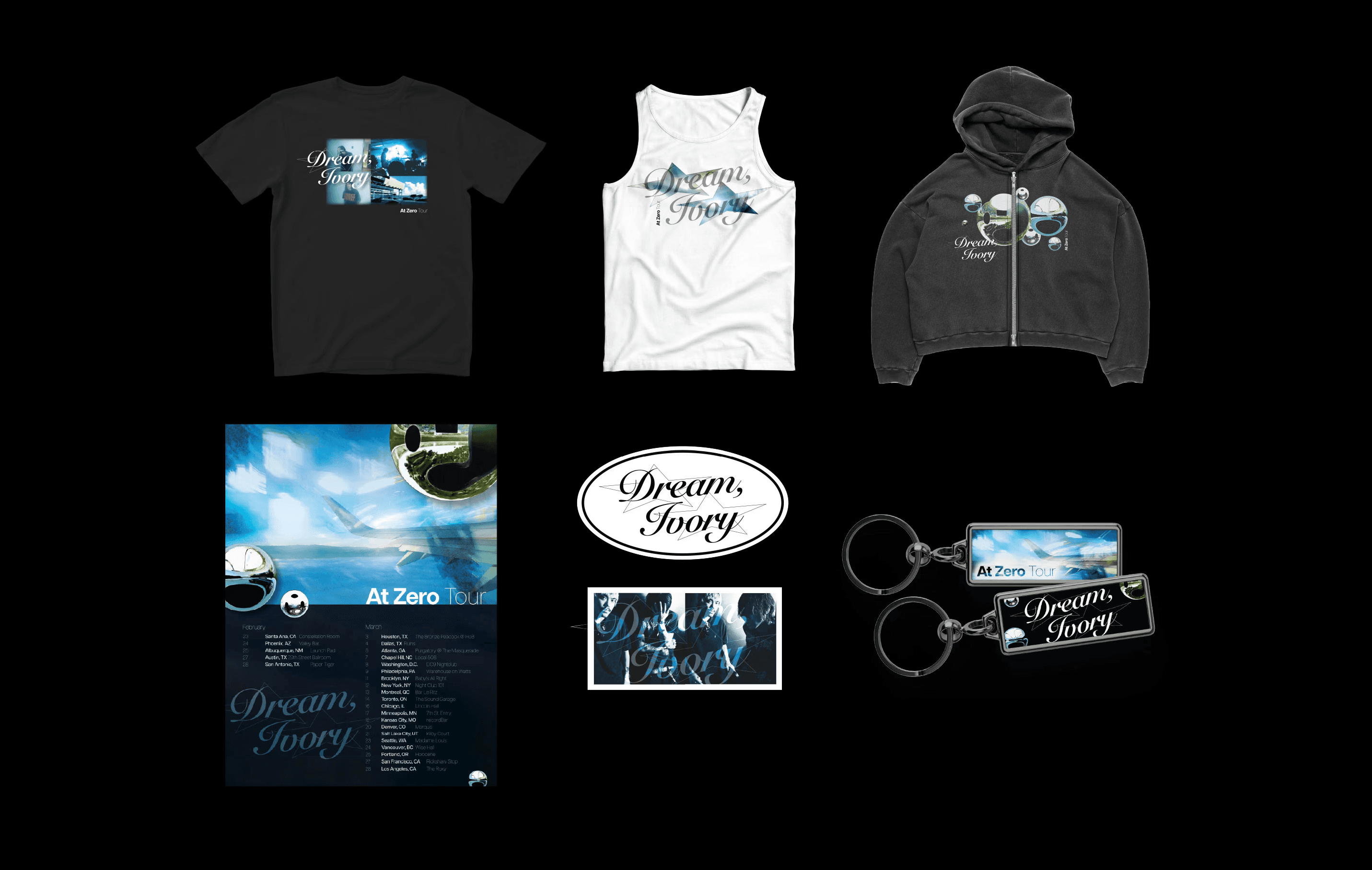 Dream, Ivory, an up and coming indie pop duo, are going on tour! And in order to gain new fans, the way they're reached must be expanded and in a more interesting way. The promotion of the duo's 'At Zero' tour is the perfect way to make them stand out. Aside from interesting promotion, an established and recognizable brand not only helps create a more cohesive tour experience, but would also makes them more recognizable, therefore giving them more exposure.