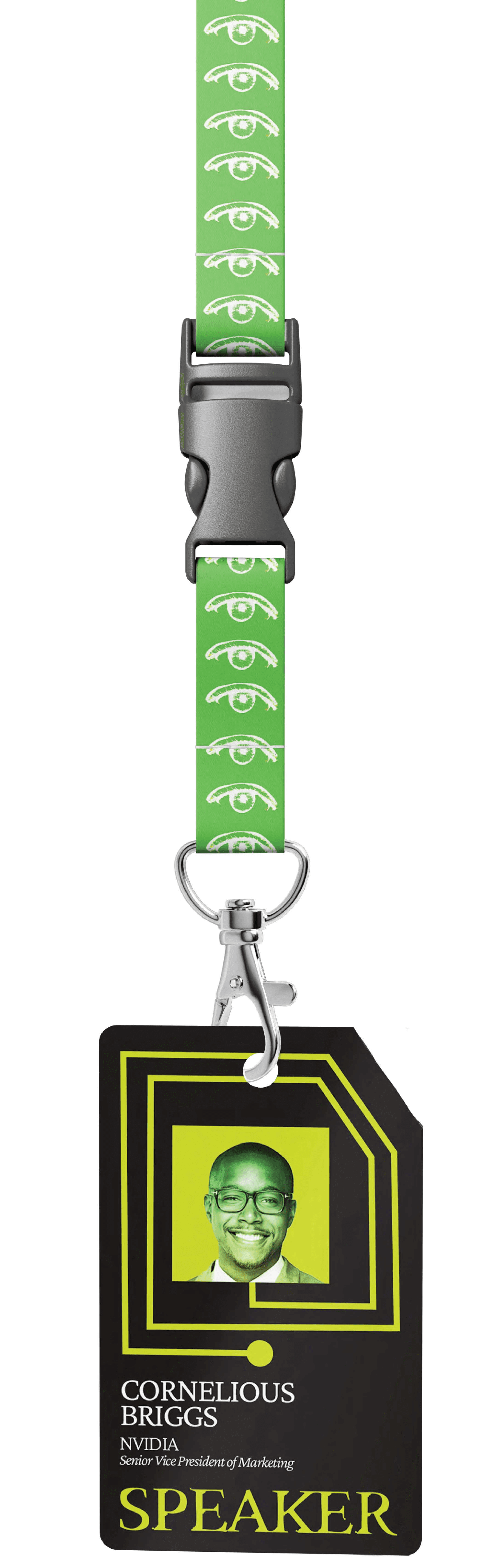 Following the theme of "hiding in plain sight", majority of the conference sign that greets attendees, is made out of glass. Decals containing the same eye pattern define the almost invisible figures and gives it the vibrant color that's used throughout the branding.